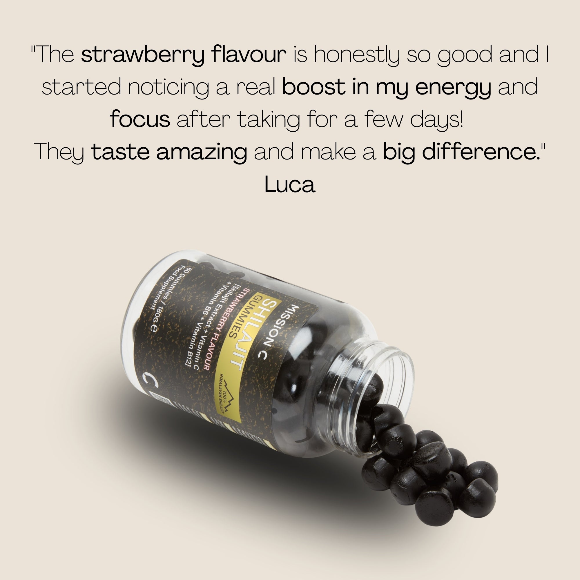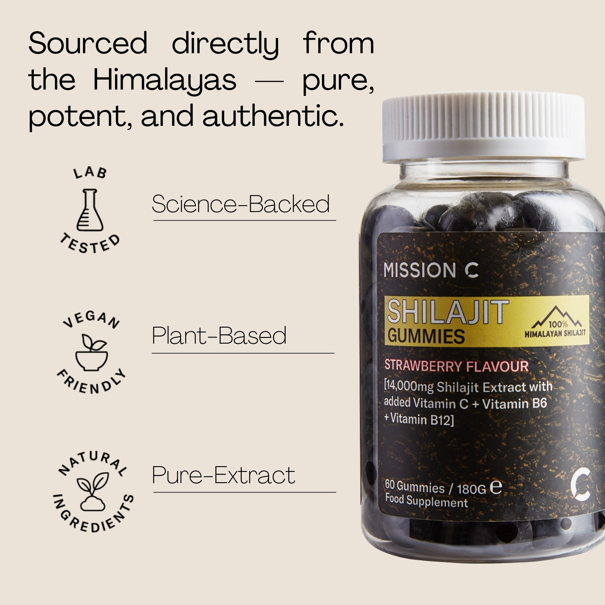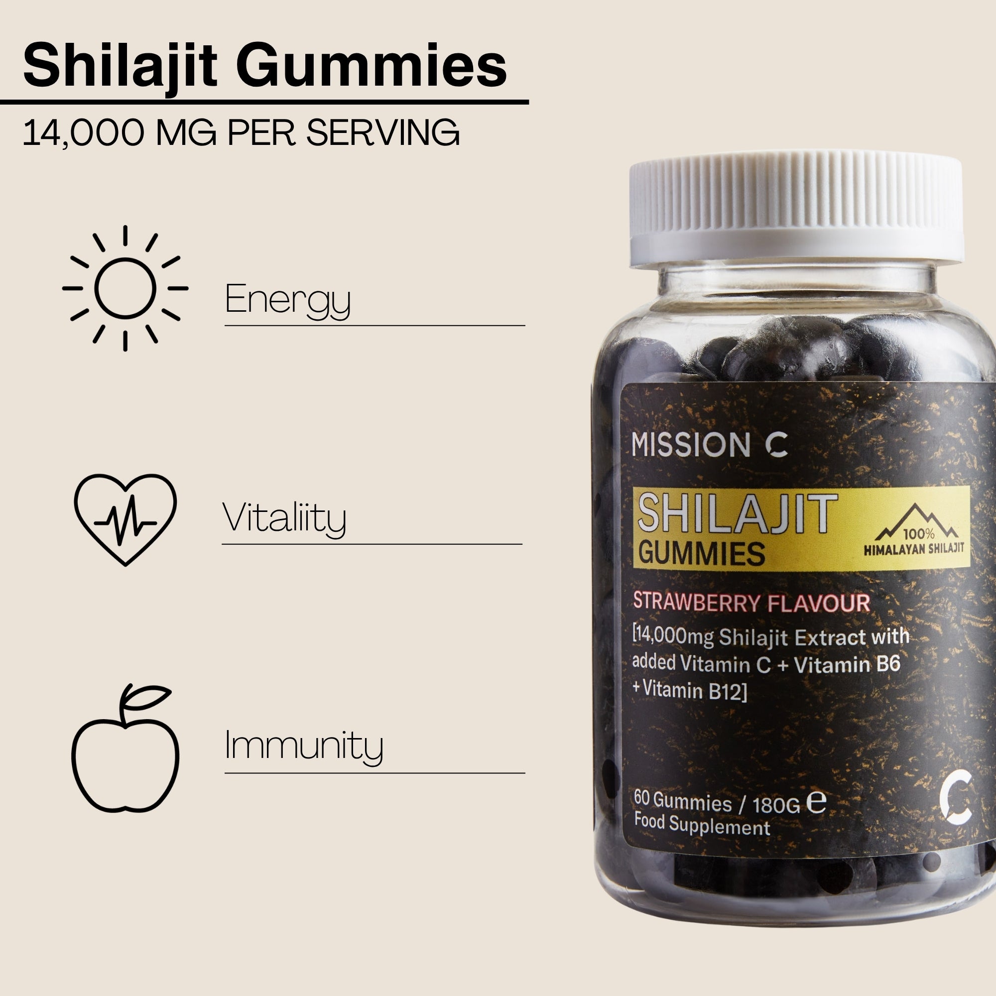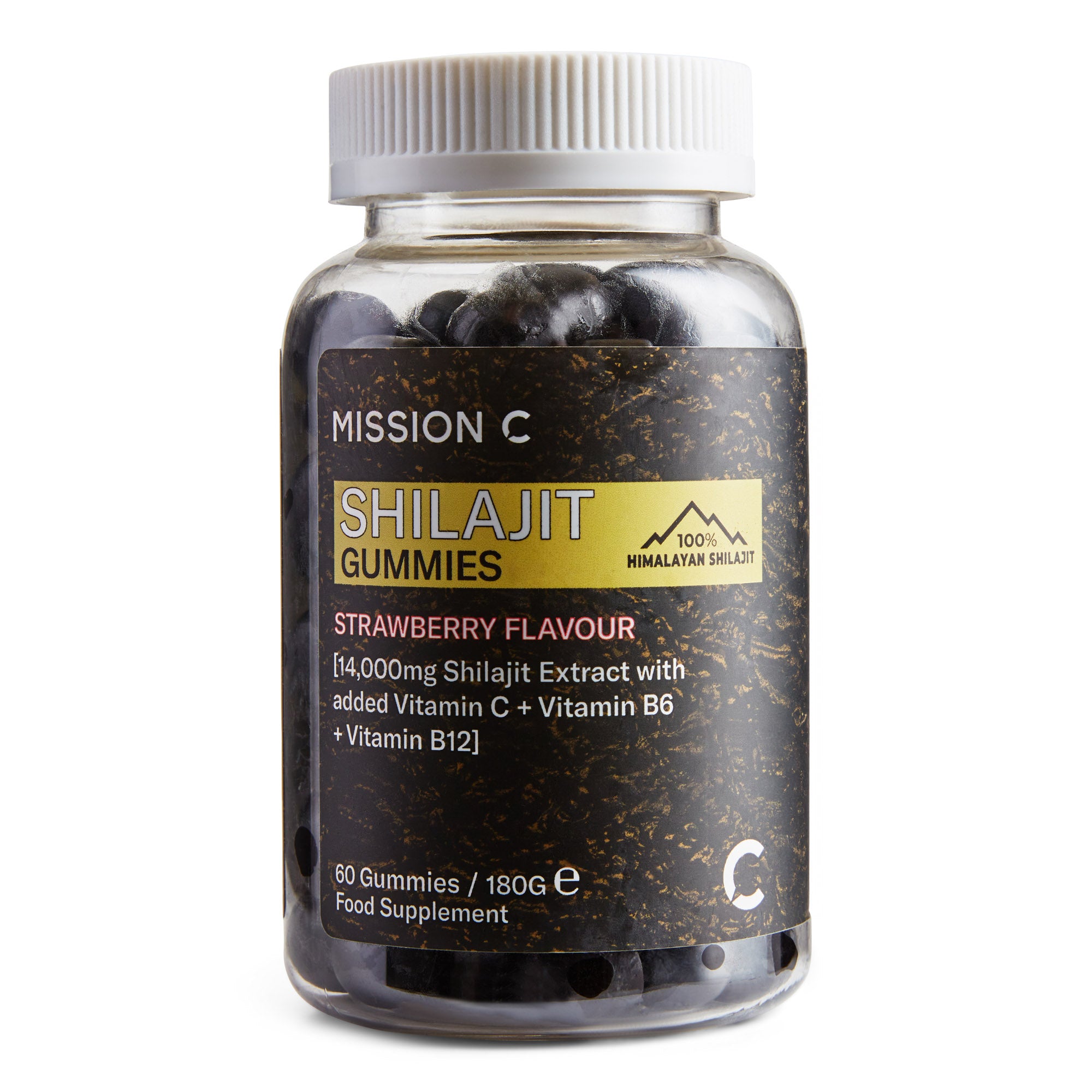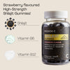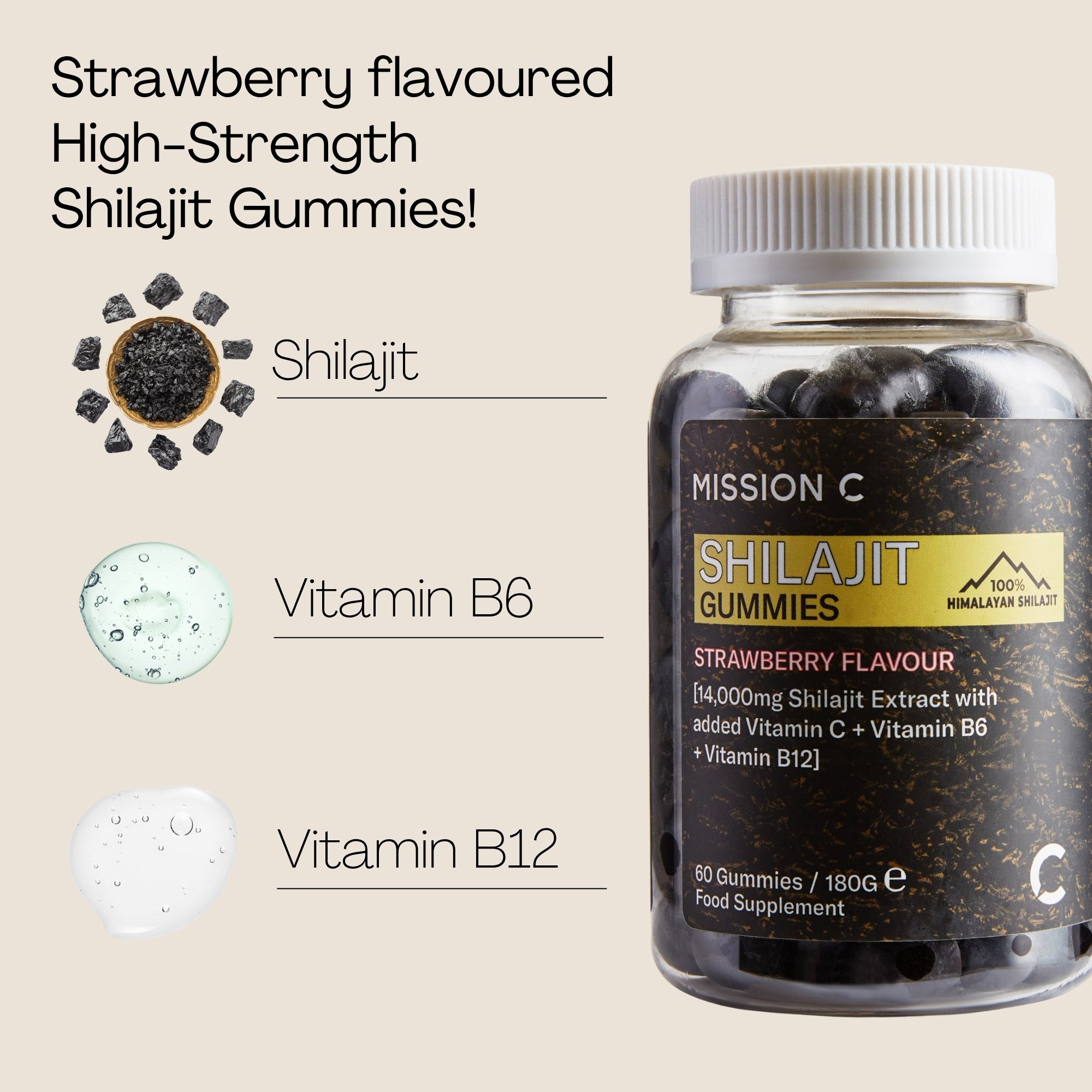 Sweeteners (Maltitol, Erythritol), Purified Water, Shilajit Extract (20% Fulvic Acid), Humectants (Sorbitol), Gelling Agent (Pectin), Vitamin C (Ascorbic Acid), Acidity Regulatory (Sodium Citrate, Citric Acid), Flavour (Natural Strawberry Flavour), Glazing Agents (Sunflower Oil Carnauba Wax), Anthocyanins (Purple Carrot Juice Concentrate), Vitamin B6 (Pyridoxine Hydrochloride), Vitamin B12 (Cyanocobalamin).